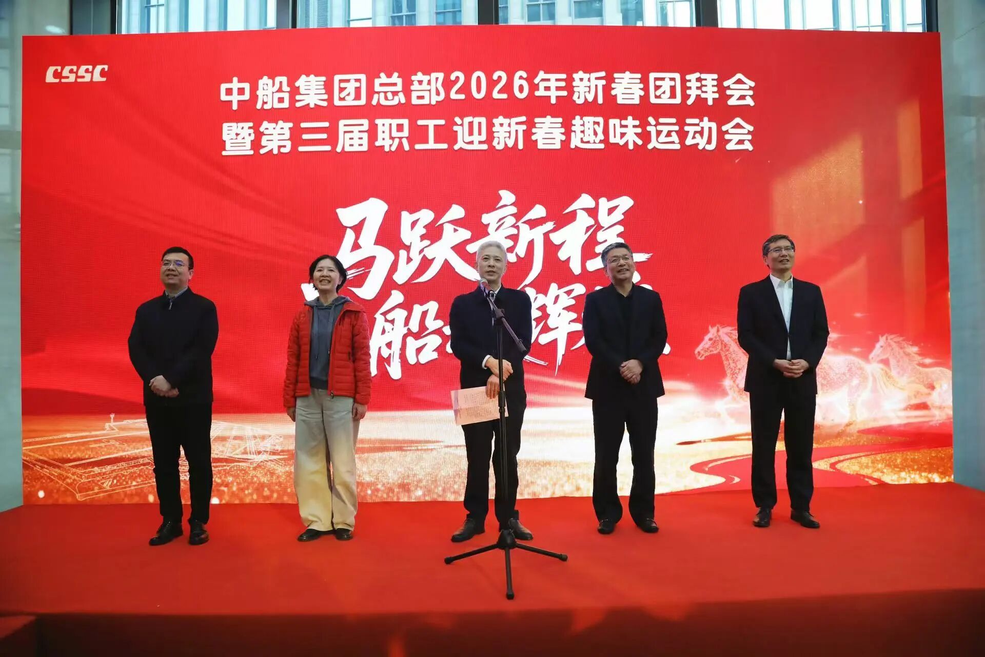 金蛇辭歲,駿馬迎春。在農歷馬年新春佳節來臨之際,2月11日,中國船舶集團有限公司總部舉行2026年新春團拜會暨第三屆職工迎新春趣味運動會。中船集團黨組書記、董事長徐鵬代表中船集團黨組向辛勤耕耘、篤行實干的集團全體干部職工,向始終相伴、傾情付出的全集團家屬們,致以最衷心的感謝和最誠摯的問候。黨組副書記、董事、集團工會主席賈海英,黨組成員、總會計師朱永紅,黨組成員、副總經理彭原璞、胡賢甫出席團拜會。