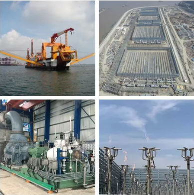 左上:裝有七一一所傳動裝置的挖泥船;左下:816壓縮機(jī);右上及右下:浙石化火炬航拍及近景圖。