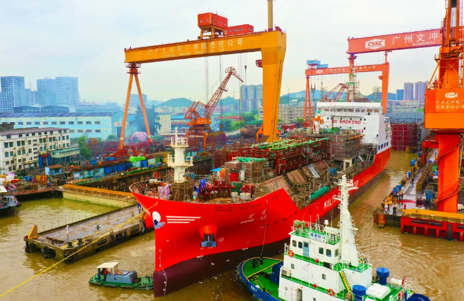 中國船舶集團旗下黃埔文沖建造的9500立方米雙燃料動力多用途氣體運輸船首制船在近日出塢。