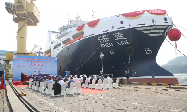 ????“深藍號”由黃埔文沖建造,七〇八所參與設計,總長約120米,型寬21.6米,設計吃水7.3米,設計航速15節,主機功率8000 千瓦,載重噸約5000噸。“深藍號”是我國自主研制建造的第一艘漁業捕撈加工一體船,也是目前最大最先進的漁業捕撈加工一體船,取得近200項知識產權保護,實現了我國現代化漁業船舶裝備領域的重大突破,達到世界先進水平;主要用于南大洋漁業捕撈,兼顧海洋科考功能,可滿足ICE-A冰區(冰厚度0.8米)及-25℃低溫環境的營運要求。