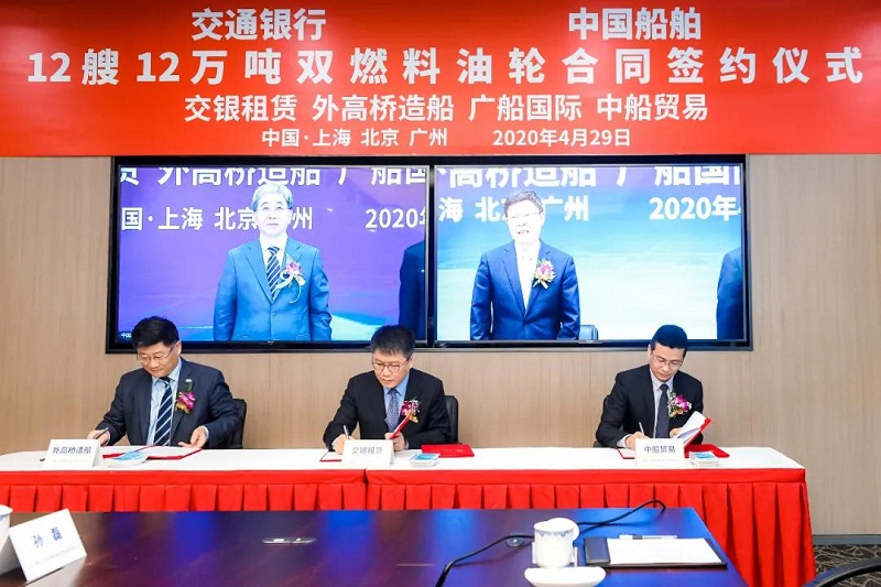 ????4月29日,中國船舶集團有限公司旗下中國船舶工業貿易有限公司、上海外高橋造船有限公司、廣船國際有限公司與交通銀行股份有限公司旗下交銀金融租賃有限責任公司在北京、上海、廣州三地以“云簽約”方式簽署12艘12萬噸雙燃料油船建造合同,合同總金額約46億元人民幣,這是中國船舶集團旗下單位近期承接的又一單筆大額訂單。中國船舶集團黨組書記、董事長雷凡培,交通銀行黨委書記、董事長任德奇,中國船舶集團黨組成員、副總經理孫偉,交通銀行黨委委員、副行長呂家進出席簽約儀式。