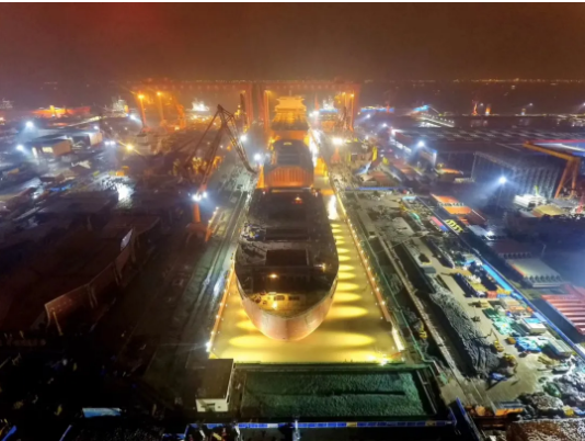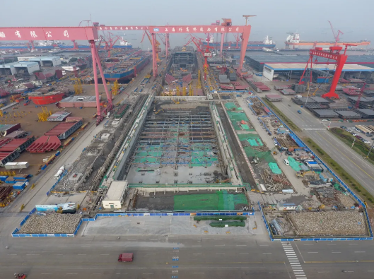 ——第二次改造,2018年10月至2020年6月,再次接長200米,建成后總長達(dá)740米。通過中間塢門分別形成前后兩個(gè)獨(dú)立塢室,以滿足年產(chǎn)1.5艘大型郵輪及3艘VLCC綱領(lǐng)產(chǎn)品要求。