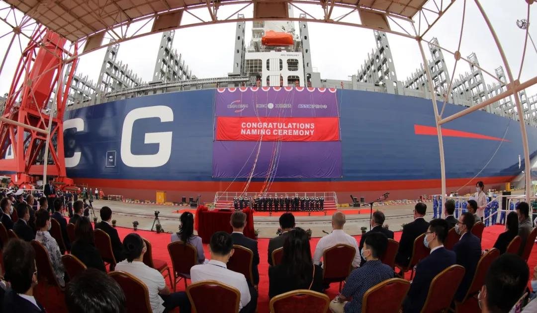 8月27日,由中國船舶集團有限公司旗下滬東中華聯合中船貿易為法國達飛海運集團建造的15000TEU超大型集裝箱系列船首制船“達飛·和風”號命名交付。這是中法兩國船海巨頭全面落實2019年中國國家主席習近平和法國總統馬克龍見證簽署的戰略合作框架協議的最新成果。同時,也標志著“CSSC超大型箱船譜系”又添“新丁”,實現了對全球超大型集裝箱船發展的引領。