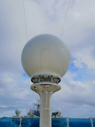 站在煙囪下面往船艏方向看,正對著1個大球,前前后后,愛達·魔都號的頂部共有5個同款大球,它們分別用于收發來自衛星的電視和網絡信號,船上“5G+WIFI”網絡系統和艙室的IPTV就是在它們的加持下才得以實現。