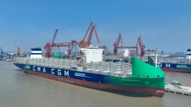 4月9日,中國船舶集團(tuán)旗下七〇八所設(shè)計(jì)、滬東中華聯(lián)合中船貿(mào)易建造的新款清潔能源“海上綠巨人”13000TEU液化天然氣(LNG)雙燃料動(dòng)力大型集裝箱船“CMA?CGM PARATY”號命名交付。