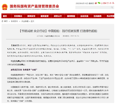 【編者按】6月13日,第32個全國節能宣傳周開啟。節能是生態文明建設的重要內容,是推進碳達峰碳中和、促進高質量發展的重要支撐。中央企業努力爭當能源清潔低碳轉型的推動者、先行者、引領者,“十三五”期間,央企能源消費總量、碳排放總量得到有效控制,能源消耗強度、碳排放強度、主要污染物排放總量持續大幅下降。6月16日,國資委網站在“節能減碳 央企行動”系列報道中,展示中國船舶集團有限公司促進社會綠色低碳的生動實踐。