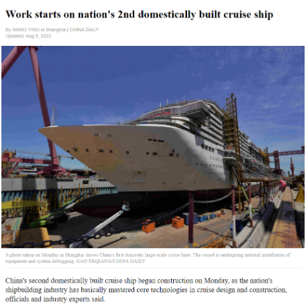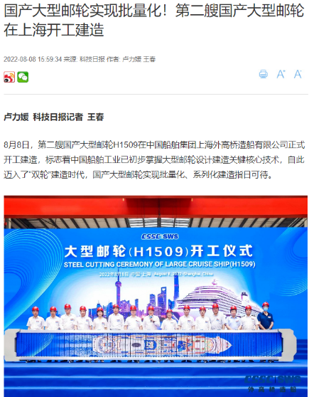 8月8日,第二艘國產大型郵輪在中國船舶集團旗下外高橋造船開建,這標志著中國船舶工業已初步掌握大型郵輪設計建造關鍵核心技術。