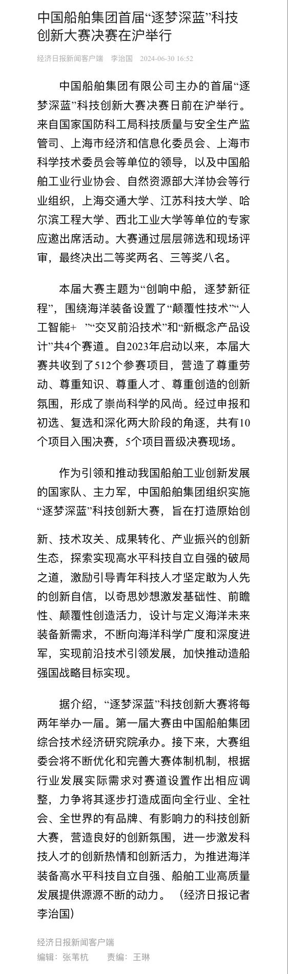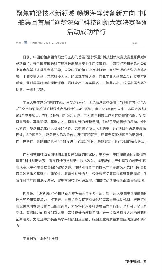 中國船舶集團有限公司主辦的首屆“逐夢深藍”科技創(chuàng)新大賽決賽暨頒獎活動引來各大媒體的關注,獲得高度評價。——>活動回顧