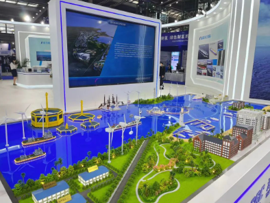 # 10萬噸級大型深遠海養(yǎng)殖工船、2000噸自升自航式風電安裝平臺、耕海一號二期工程等模型以及“藍色海洋經(jīng)濟綜合體”沙盤,生動展示出“深海養(yǎng)殖+海上文旅+海上風電”互聯(lián)互通的繁榮業(yè)態(tài)景象;